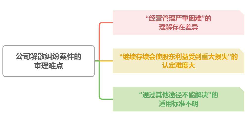 由于公司纠纷中股东矛盾的复杂性,司法实践对《公司法》第182条及《公司法司法解释二》关于公司解散“三要件”的理解存在差异,使得该类案件审理存在一定难度。